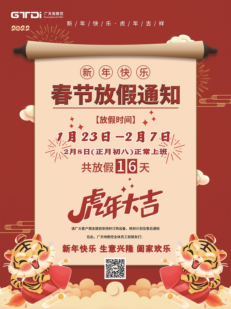 2022年春节将至,首先感谢您在2021年里的鼎力支持和愉快合作,乐鱼leyu数控全体同仁在此给您拜个早年。在新年的一年里,乐鱼leyu将更加努力,为您提供更优质的服务。按照国家春节放假规定结合我司的具体情况,春节放假时间安排如下: