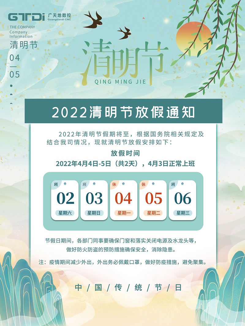 根据国务院办公厅《关于2022年部分节假日安排的通知》,并结合我司实际情况,乐鱼leyu数控2022年清明节放假安排如下: